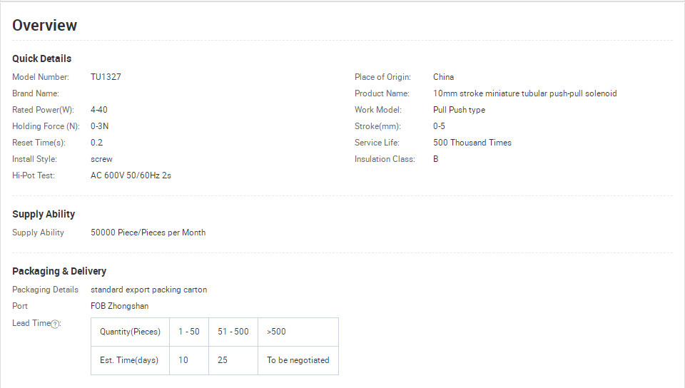 A: Following parameters should be provided: voltage(DC/AC), power, current, resistance, stoke, force, dimension limit, force, residual force, duty cycle, etc.